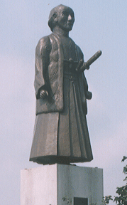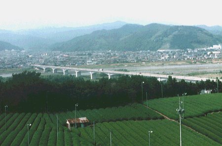 阪本茶農協の茶工場から茶畑の中を北へ300メートルほど行った、大井川と島田市を見晴らす絶景地に、”中條景昭の像”が牧ノ原の大茶園を見守るように立っています。中條景昭は幕末の混乱期に新徴組として旗本を率い江戸市中取締りに任じた剣の達人でした。江戸城明け渡しの後、慶喜に従って静岡へ移り住み、勝海舟等の勧めで240名余りの無祿の移住士族を率いて牧ノ原の茶園開拓に入植しました。 剣を鍬に持ち替えての開拓事業で苦難の連続でしたが、最後まで破綻を来すことが無かったのは隊長としての中條景昭の殖産報国の固い信念と統率力によるものといえます。農地の売買が可能になり、仲間が慣れない労苦に耐えかねて次々と離農していく中で、死ぬまでこの地を離れずに隊長としての責任をはたしました。 ある時、中條景昭を神奈川県令に推薦する動きがあり、牧ノ原まで説得に出向いた山岡鉄舟に対して、「一たん山へ上がったからはどんなことがあっても山は下りぬ。お茶の木のこやしになるのだ」と一笑にふしたというエピソードが残っています。 ともあれ、中條景昭たちの努力がなければ、現在の牧ノ原の隆盛はまた別の形になっていただろうと思われます。 写真は徳川幕臣牧之原入植120年に当たる昭和63年10月、中條金之助景昭像建立実行委員会の手によって建立された”中條景昭の像”です。 |