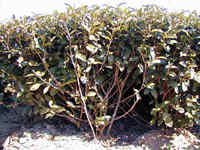 こうした茶園で枝の太さを観察すると、中央付近が太く、裾部の枝が細くなっているはずです。そのような枝の不均一は、剪枝強度が均等に行われなかったために起こる現象で、中央の徒長しやすい枝を強く、側枝を弱く剪枝することで強さの均一化をはかります。 |