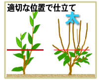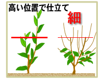 幼木時代に剪枝をする目的は、定芽を出すことです。幹の部分から出た芽は強く伸びて骨格となる枝ができます。栄養状態が悪いのに高い位置で剪枝をすると下右図のように側芽が多くなって枝が細くなり、望ましい樹形になりません。 早く株張りが欲しいために、広がった高い位置で剪枝したくなりがちです。しかし、高い位置で剪枝して芽を多く残すと、細い部分から側芽が多く出るため枝が弱くなってしまいます。深く剪枝すると樹体が小さくなってしまうように感じますが、段階的に大きくするのが早期成園化の技術です。良い枝をつくる仕立てのポイントは、2〜3つの芽を期待する程度の位置で行うことです。 |